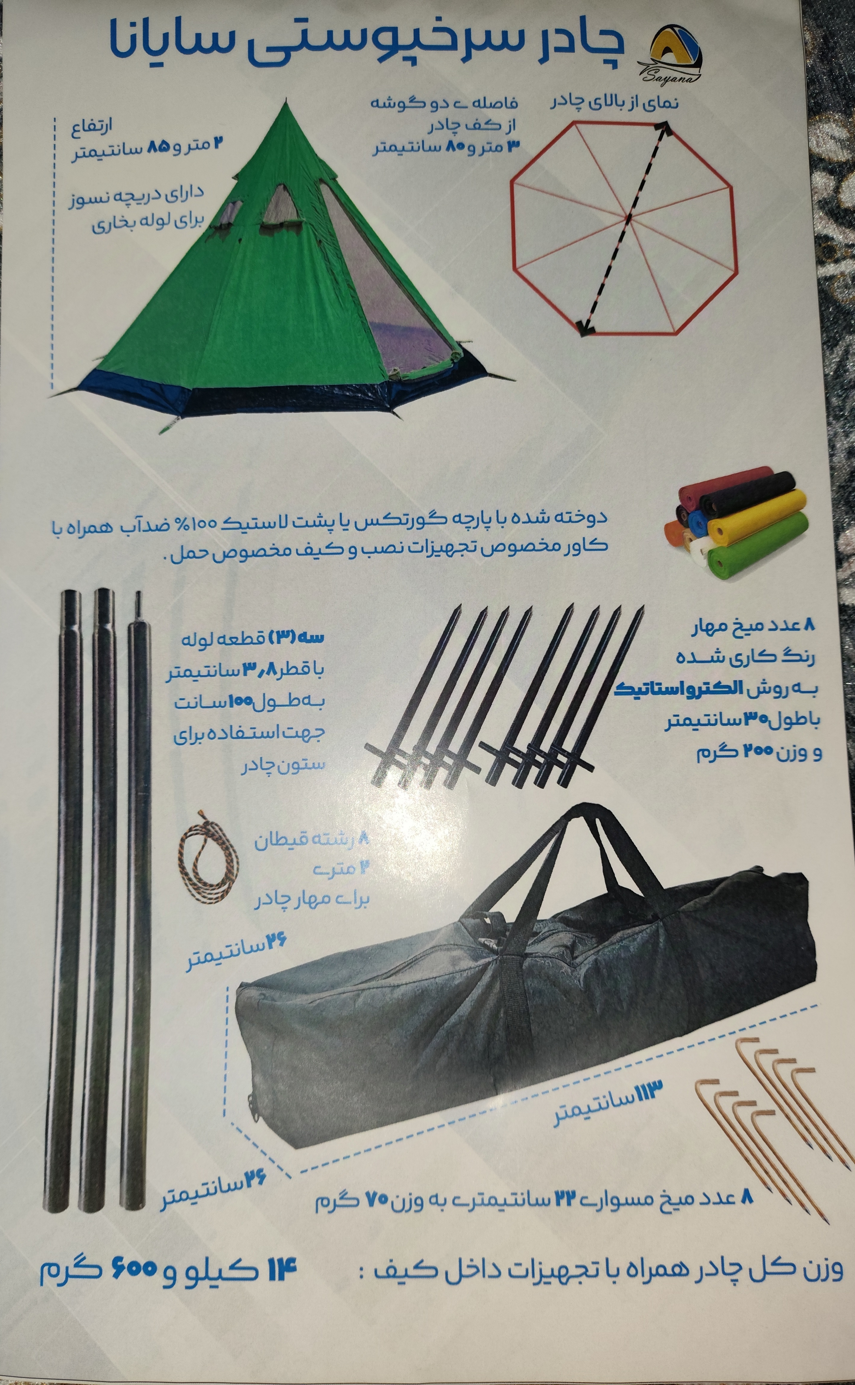 جنس کف چادر : ضد آب فاصله دوگوشه از کف به ۳متر و ۸۰ سانتی متر می رسد
