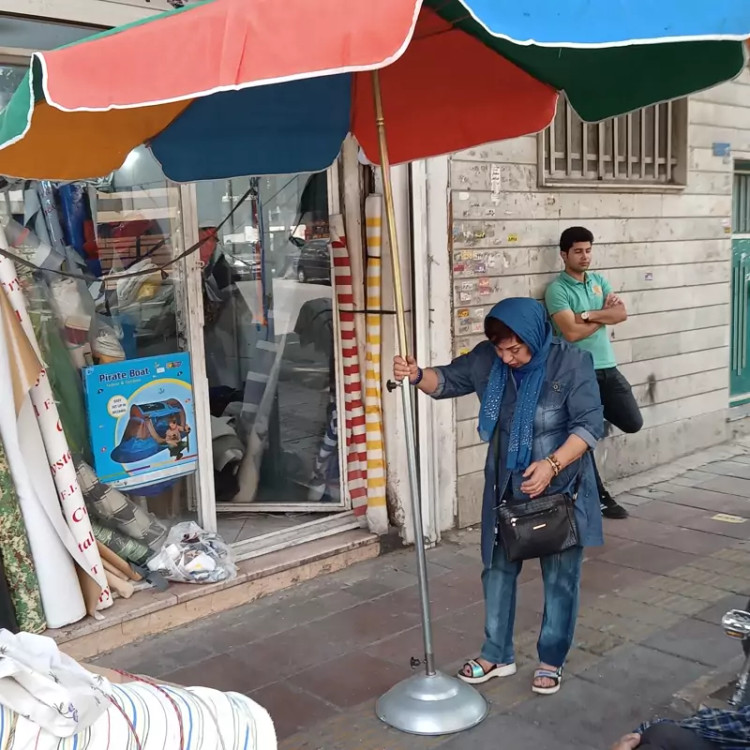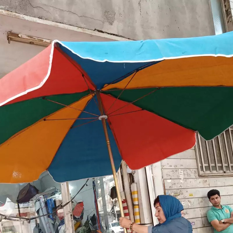 چتر سایبان از جنس برزنت و اسکلت آهنی بسیار محکم و پایه وسط که سایه آن بسیار خنک میباشد ضد آب نیست و برزنتی مناسب آفتاب است دارای یک لوله برای تنظیم ارتفاع و یک پایه برای ایستادن کف زمین است تا شو بوده و در صندوق ماشین قابل حمل است