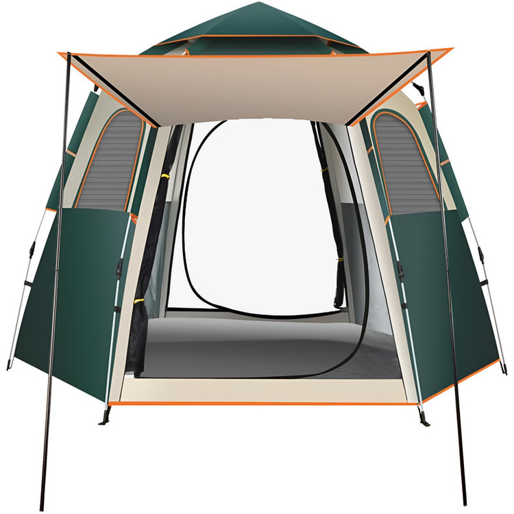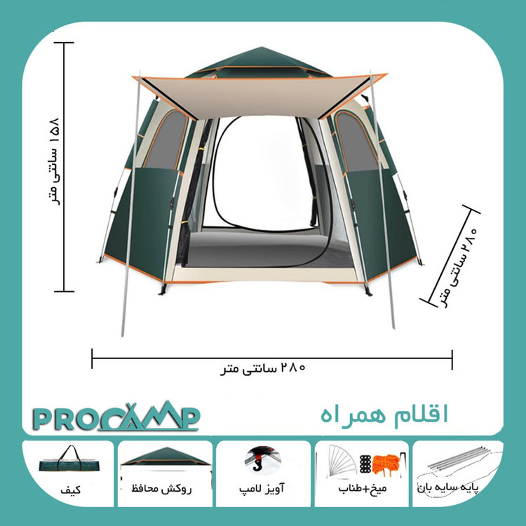 چادر اتوماتیک کمپینگ پروکمپ(procamp) مدل JH-8206-5 ، ماجراجویی های کمپینگ را راحت تر و دلپذیر تر می کند. این محصول تغییر دهنده شیوه برپایی چادر کمپینگ در سهولت و کارایی است. این چادر که هم برای کمپینگهای باتجربه و هم برای تازه واردان طراحی شده است، راحتی، دوام و راحتی بینظیری را برای تمام گردشهای شما در فضای باز ارائه میدهد. این محصول که به شکل یک شش ضلعی طراحی شده به دلیل ویژگی تنظیم خودکار خود که به چادر اتوماتیک معروف شده مزیت خوبی دارد که به شما امکان می دهد در چند ثانیه چادر خود را برپا کرده و یا جمع کنید. چادر با طراحی پاپ آپ(pop up) مبتکرانه خود، تقریباً فوراً به شکل چادر در می آید و زحمت مونتاژ چادرهای سنتی را از بین می برد. فضای سخاوتمندانه ای در این مدل چادر سفری برای جای دادن راحت تر افراد ارائه می شود. طراحی خوب آن شامل فضای سر زیاد و فضای داخلی جادار است که تجربه ای راحت را حتی در سفرهای طولانی تضمین می کند. این چادر دارای دو پنجره مشبک بزرگ و منافذ تهویه برای افزایش جریان هوا است ، دو در نیز که هر دو دارای سایبان هستند نیز در دو طرف دیگر تعبیه شده و فضای داخلی را حتی در شب های گرم، خنک و تازه نگه می داردو از این رو برای سه فصل مناسب است. لازم بذکر است که همه در ها و پنجره ها دارای توری پشه بند با زیپ جدا و محل جمع شدن جدا از روکش در و پنجره هستند. چادر کمپینگ پرو کمپ مدل JH-8206-5 با مواد با کیفیت، برای مقاومت در برابر عناصر طبیعی ساخته شده است. این چادر دارای یک پوشش مقاوم و ضد آب با پارچه 210D آکسفورد است و همچنین یک کف بادوام و مقاوم در برابر آب که محافظت قابل اعتمادی در برابر باران، باد و رطوبت دارد.استاندارد ضد آب آن PU2000mm گزارش شده است. میله های قوی و مستحکم و درزهای تقویت شده در مقابل نفوذ آب به دوام کلی آن کمک می کند و اطمینان حاصل می کند که چادر در شرایط مختلف آب و هوایی عملکرد خوبی دارد. ابعاد این چادر ۱۵۸×۲۸۰×۲۸۰ سانتی متر بوده که در دو طرف آن سایبان با ابعاد ۱۳۰×۱۴۰ سانتی متر هم برپا می شود که کارایی آن را دوچندان می کند. چادر کمپینگ اتوماتیک پروکمپ مدل JH-8206-5 با راه اندازی سریع و آسان، طراحی جادار و محافظت قابل اعتماد در برابر آب و باد، تجربه ای بدون دردسر و لذت بخش در فضای باز را تضمین می کند.
