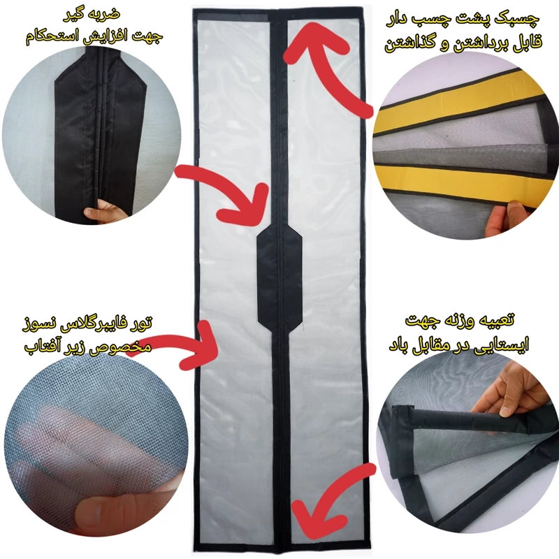 پرده توری مگنتی ( مغناطیسی ) مدل آهنربا یکسره ( مخفی ) ضربه گیردار بهترین وسیله جهت جلوگیری از ورود حشرات و موجودات موذی ، گرد و خاک و... نصب آسان و سریع بدون نیاز به ابزار نمای زیبا و شیک قابل شستشو تهیه شده از بهترین متریال پرده ها دورتادور نواردوزی شده بالا و کناره ها : دارای چسب مسلح جهت نصب وسط : نوار اهنربا یکسره (مخفی ) و ضربه گیر پایین : چرم و وزنه تعبیه شده جهت ایستایی در مقابل باد