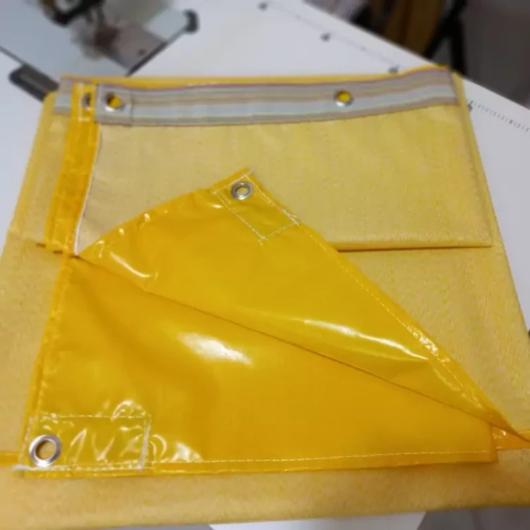 برزنت ضدآب شمعی دوخت پرده حیاط و بالکن و راه پله برای جلوگیری از ورود سرما و آب همراه با حلقه پرسی و نوار دوزی و دور دوخت رنگ زرد ابعاد ۲ در ۱.۷ متر طول