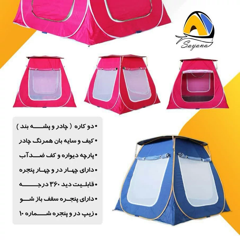 چادر مسافرتی اسکلتی جنس خوب برنو دارای دید ۳۶۰ درجه زیپ پنجره شماره ۵ و درب زیپ دو سر شماره ۱۰. کف ضخیم و کیف ضخیم دارای سایبان ارتفاع بلند ۲۲۰ سانت
