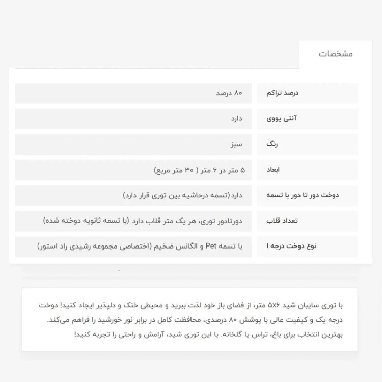 توری شید، 6 در 5، 80 درصد انتی یووی دار میباشد که از اشعه خطرناک خورشید جلوگیری میکند، دوخت درجه 1 (منظور تسمه و دوخت بسیار قویتر میباشد) ، تسمه محکم دور کار و هر متر یک قلاب با تسمه ثانویه دوخت خورده، این محصول اماده هست. این ابعاد اماده و بسته بندی شده هست، زمان تحویل به پست، بسته به زمان ثبت سفارش، بین 1 تا 3 روز میباشد.