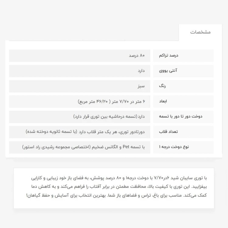 توری سایبان شید، آنتی یووی دار بوده که از اشعه خطرناک خورشید جلوگیری میکند و دربرابر آفتاب مقاومت بالایی دارد. دوخت درجه 1 (منظور تسمه و دوخت بسیار قویتر میباشد)، یک تسمه محکم دورتا دور توری، و هر متر یک قلاب با تسمه ثانویه دوخت خورده است. توری سایبان شید، برخلاف برزنت، هوا را خف نمیکند و هوا در جریان هست و وزن سبکی دارد که دیگر نیازی به سازه سنگین برای نصب، مثل برزنت ندارد. همچنین ارزان تر و با دوام تر است. تراکم توری 80 درصد بوده که یعنی 80 درصد جلوی نور خورشید را میگیرد، در واقع سایه دهی آن حداقل 80 درصد است. این میزان سایه برای بخش عمده نیاز افراد کاربرد دارد، مثل سایه برای خودرو، استخر، حیاط و ... حتی برای گل و گیاهان هم، جلوی سوختگی برگ ها در بهار و تابستان میگیرد ، در زمستان، برای برخی گیاهان، باعث کاهش رشد میشود ولی خرابی گیاه را در پی ندارد.