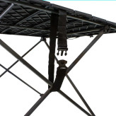میز تاشو مسافرتی فایبرگلاس بزرگ آتروپاد مدل APD-FB، یکی از جدید ترین میز مسافرتی تولید شده توسط برند ایرانی ای پی دی بوده که بر خلاف مدل قبلی خود کمی از ابعاد بزرگتری برخوردار می باشد از همین رو بازه انتخاب مصرف کنندگان را بر اساس نیاز های خود افزایش داده است. این میز تاشو کمپینگ در واقع متشکل از سه قسمت مجزا بوده که به سادگی به یکدیگر متصل شده و قابل استفاده خواهد بود. صفحه رویی، پایه تاشو و فریم های متصل کننده صفحه رویه به پایه های تاشو، سه قسمت تشکیل دهنده این میز محسوب می شود. پایه و فریم ها تولید شده از آلیاژ فلز روکش دار ضد زنگ بوده که در برابر فرسایش و تغییر رنگ و همچنین در برابر تغییر حالت مقاوم خواهد بود. این پایه ها در قسمتی که روی زمین قرار می گیرند دارای ترمز های پلاستیکی فشرده بوده تا از لغزش و سر خوردن هنگام استفاده جلوگیری کند. همچنین صفحه رویی نیز تولید شده از جنس پلی پروپیلن با رویه طرح دار بوده از رنگ تیره بهره می برد. دو تسمه برزنتی در قسمت های کناری و دو تسمه دیگر در دو طرف دیگر میز تعبیه شده که همگی با توجه به داشتن قفل پلاستیکی استحکام این میز را افزایش می دهند. ابعاد باز شده میز تاشو برابر با 82 × 50 × 59 سانتی متر بوده در حالی که این میز در شکل جمع شده ابعاد 83 در 21 سانتی متر به خود می گیرد تا با توجه به داشتن وزنی حدود 3.7 کیلوگرم به وسیله ساک حمل مخصوص به خود به سادگی قابل حمل باشد. این ساک حمل برزنتی ضد آب بوده و دارای زیپ و دستگیره نیز می باشد.
